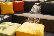 Weerbestendig het hele jaar door: Deze hocker is ontworpen om permanent buiten te staan. De combinatie van Sunbrella-stof en aluminium maakt hem bestand tegen alle weersinvloeden.